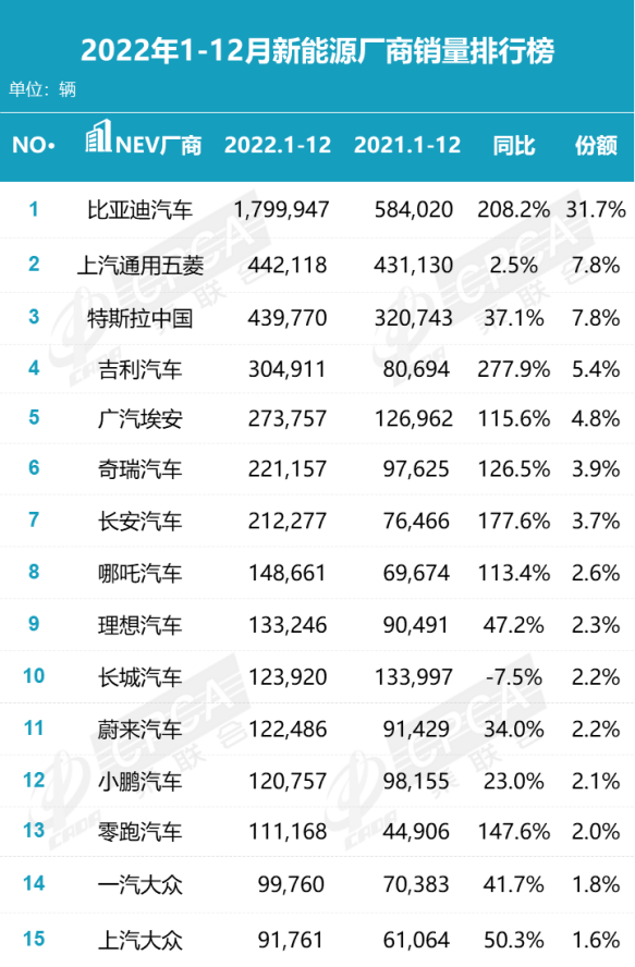 2022年的销量榜单,前三甲还是熟悉的面孔,依旧被比亚迪、上汽五菱、特斯拉这三家霸榜。